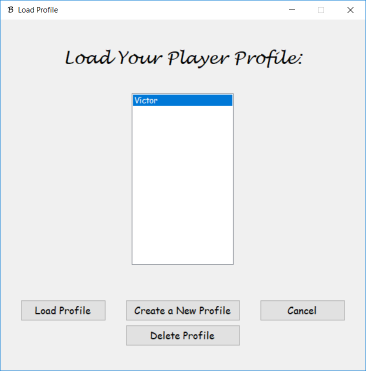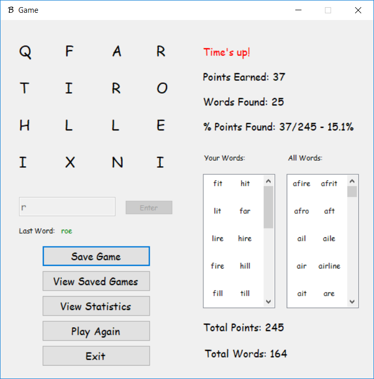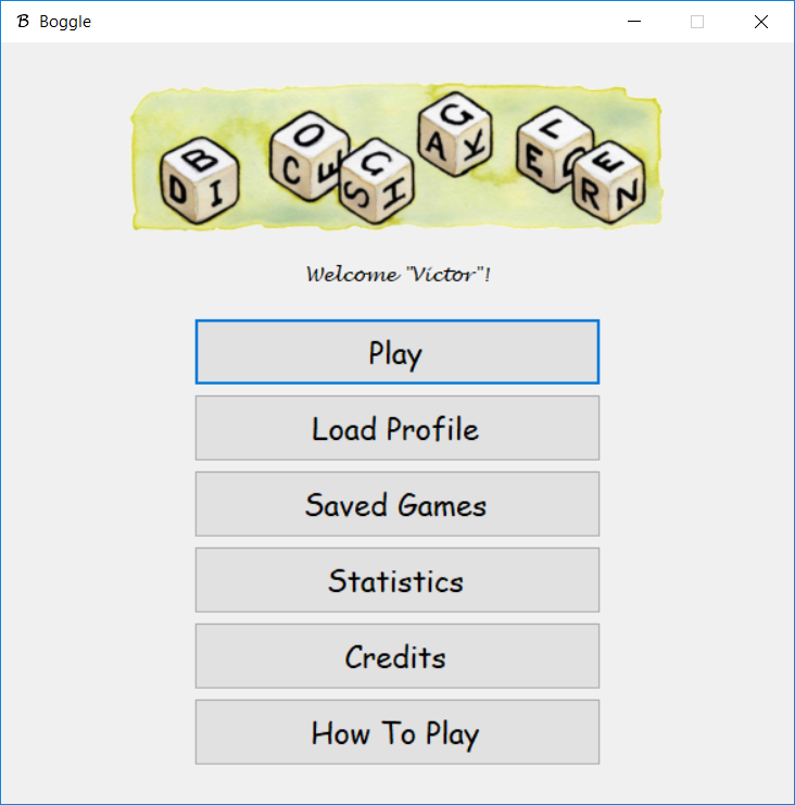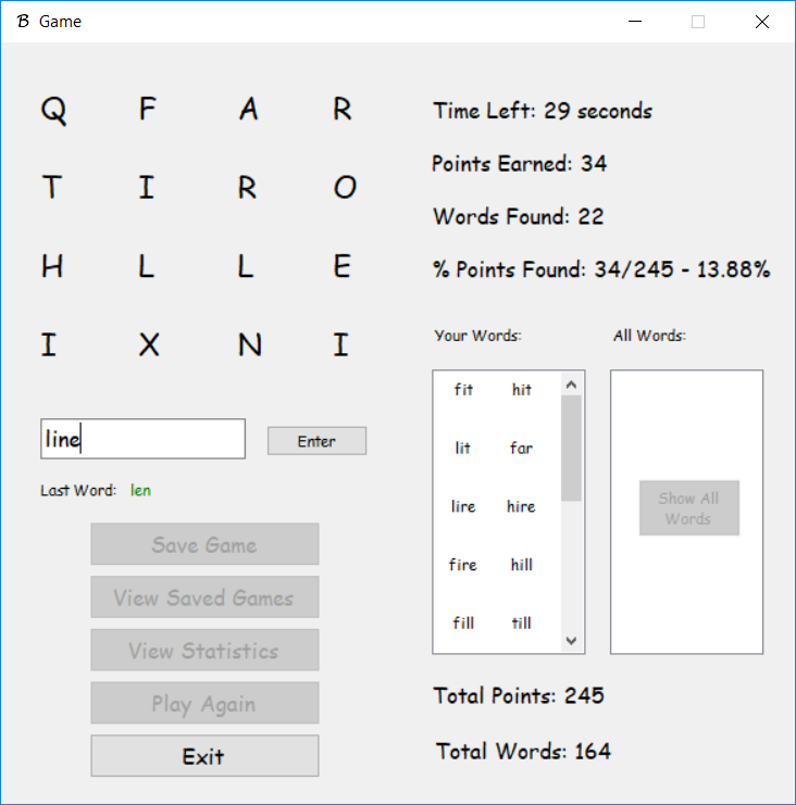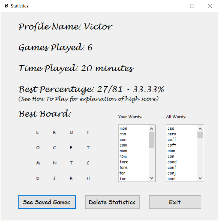 Lastly I built the game around the boggle grid. I added a 2 minute timer for the game, ListViews that displays the user's found words and all the words, and other extras like profile loading, statistics, game-saving, and music. All the profile information, statistics, and game-saving is stored in txt files, which are read as the application starts and overwritten with new data as the application closes. The Last Player is just another txt file with the name of the last player in the first line. The game searches for that name through all the profiles and loads that profile before the game even starts.