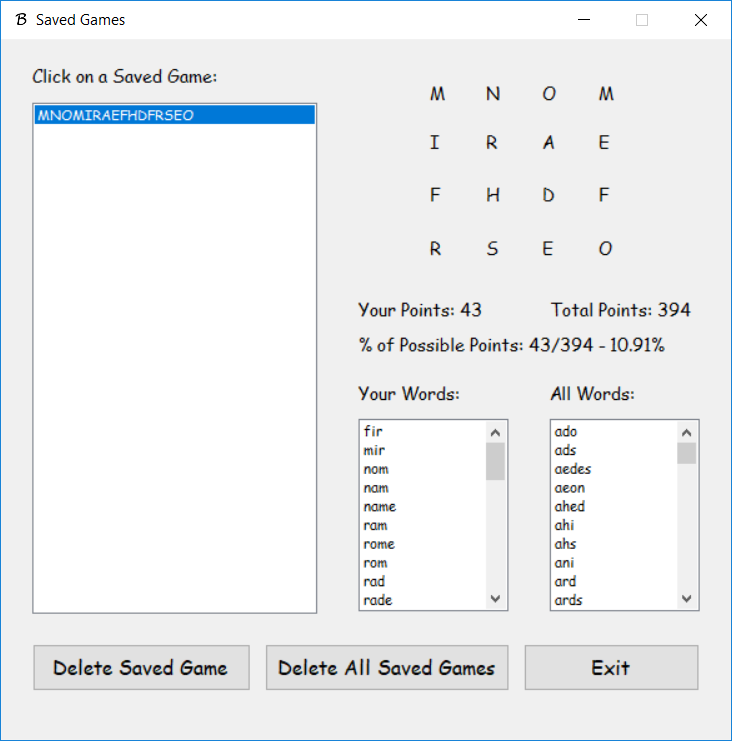 To speed up the process of checking player-entered words as valid English words, the solver first, before the game even starts, finds all the paths through the grid. It then checks if each path is an English word and if it is, stores it into an ArrayList. Then, as the player enters words during the game, the solver checks them against the ArrayList of known words, instead of the whole entire list of English words. This speeds up the game considerably as the solver doesn't have to loop through all the English words everytime the player enters a word.