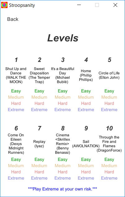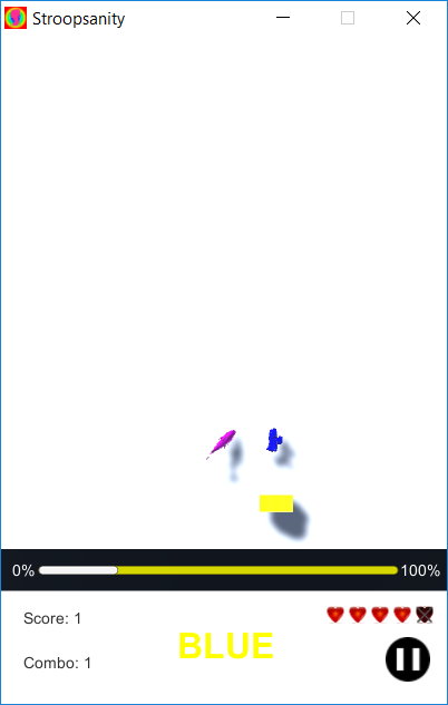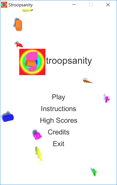 Stroopsanity is a one-player 2D computer game developed using the Unity Game Engine. The game is based on the Stroop effect, which is a demonstration of delayed reaction time due to conflicting word definitions and colors.